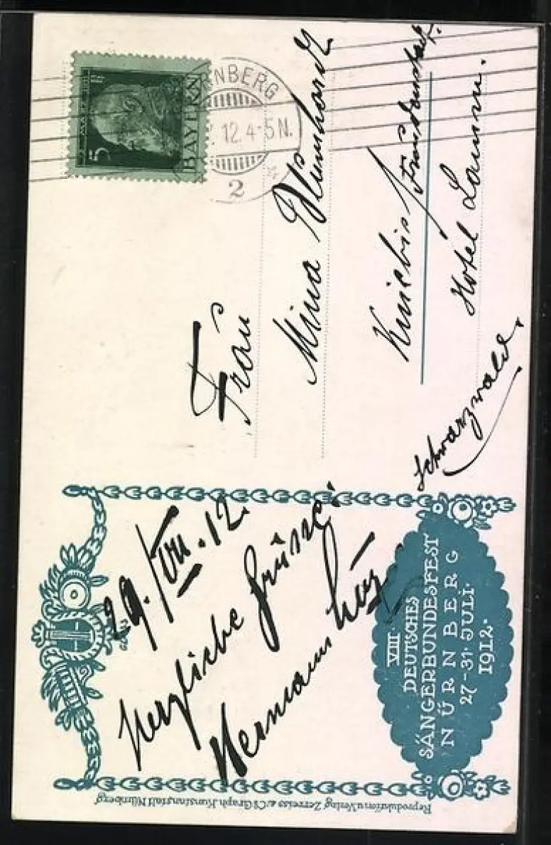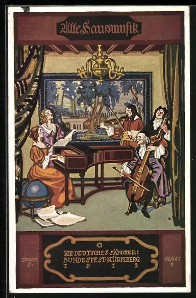 Künstler-AK Nürnberg, VIII. Deutsches Sänger-Bundesfest 1912, Alte Hausmusik mit Musikinstrumenten