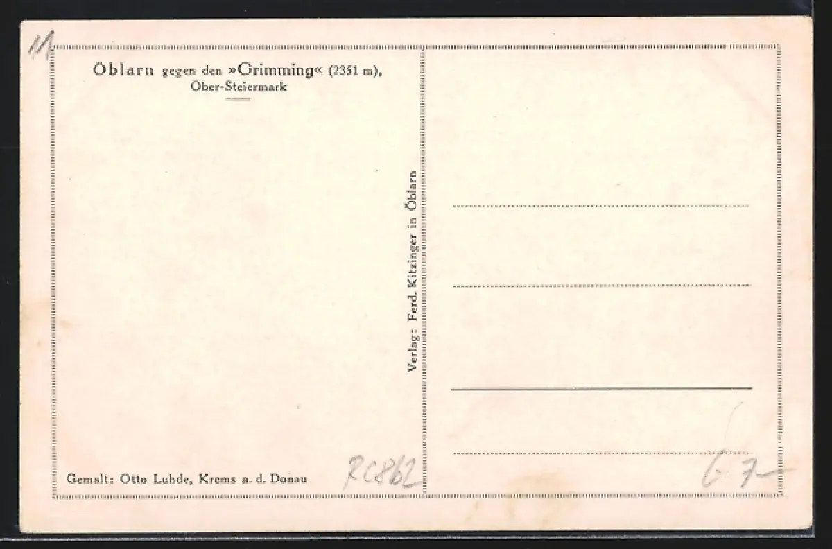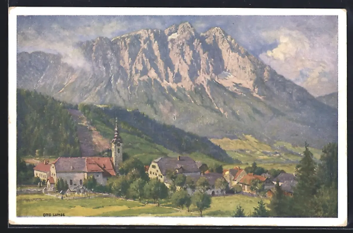 Künstler-AK Öblarn, Ortsansicht gegen den Grimming