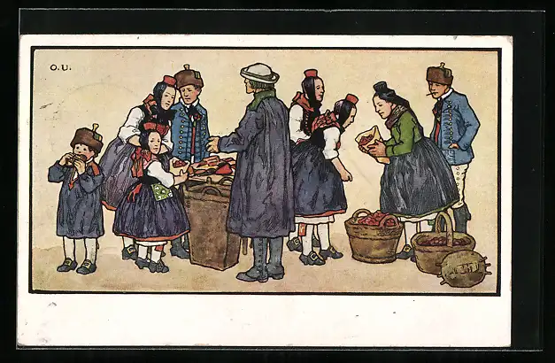 Künstler-AK Otto Ubbelohde: Bürger in hessischer Tracht auf dem Schwälmer Markt