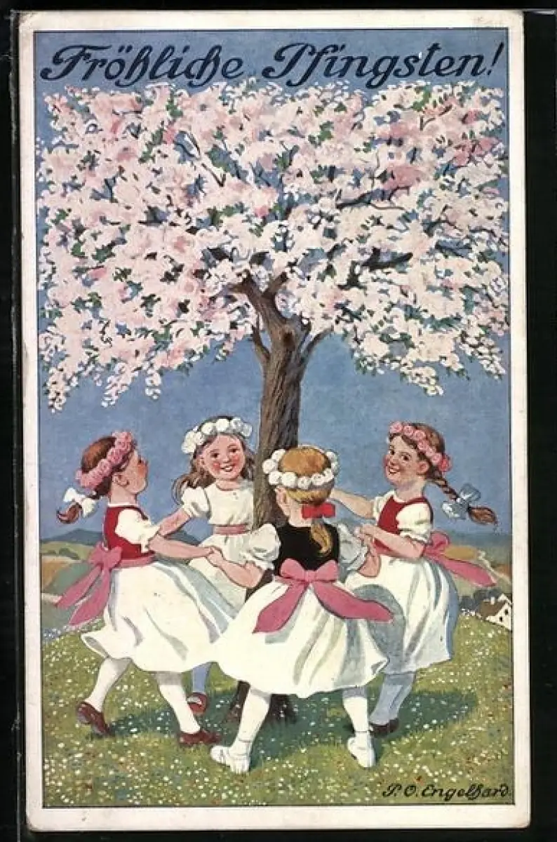 Künstler-AK P.O.Engelhard (P.O.E.): Mädchen tanzen unter einem blühenden Baum
