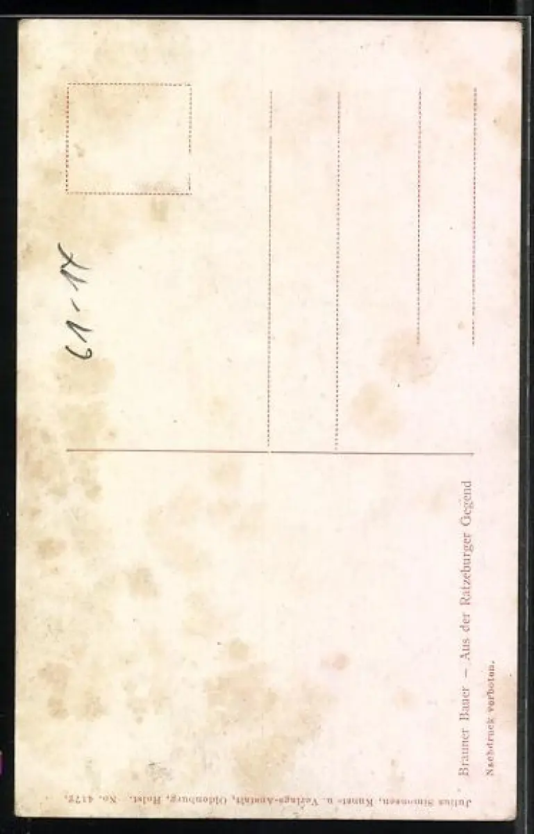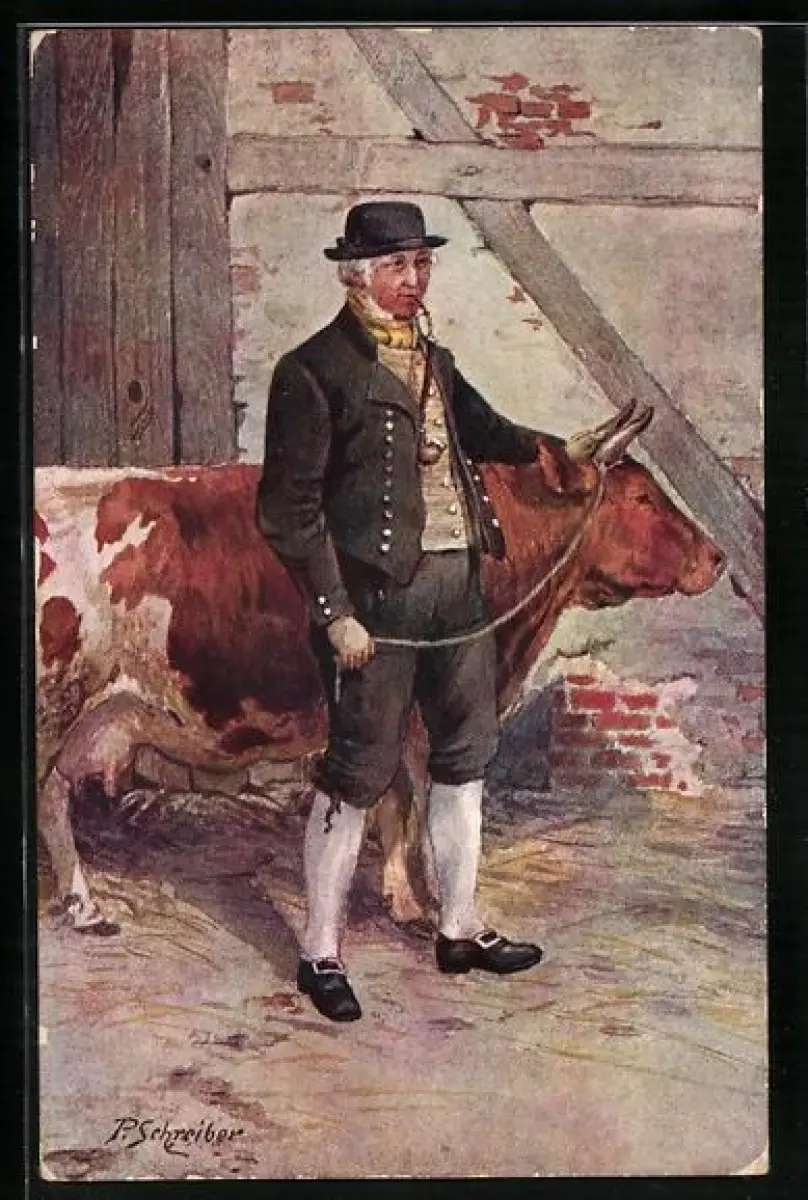 Künstler-AK P.Schreiber: Brauner Bauer mit Pfeife beim Stier