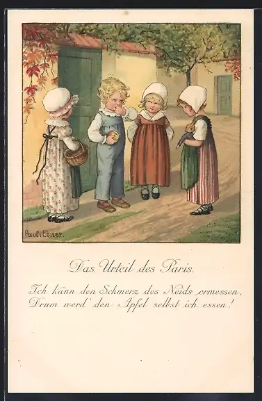Künstler-AK Pauli Ebner: Das Urteil des Paris, Kind beschliesst einen Apfel zu essen