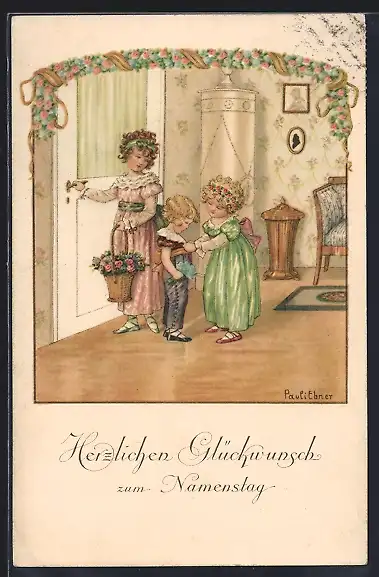 Künstler-AK Pauli Ebner: Drei Kinder mit Blumenkorb an der Tür, Neujahrsgruss