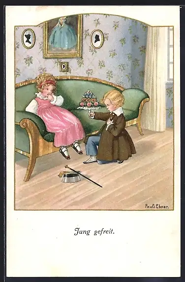 Künstler-AK Pauli Ebner: Junge schenkt einem Mädchen kniend Blumen