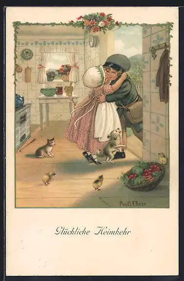 Künstler-AK Pauli Ebner: Knabe küsst das Mädchen, glückliche Heimkehr, Küken und Katze in der Küche