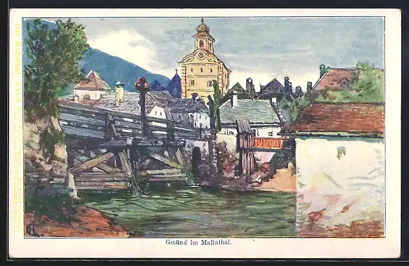 Künstler-AK Philipp + Kramer Nr. XXI /6: Gmünd i. Maltathal, Teilansicht mit Brücke
