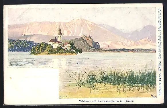 Künstler-AK Philipp + Kramer Nr. XXII /5: Veldersee mit Karawankenthurm in Kärnten