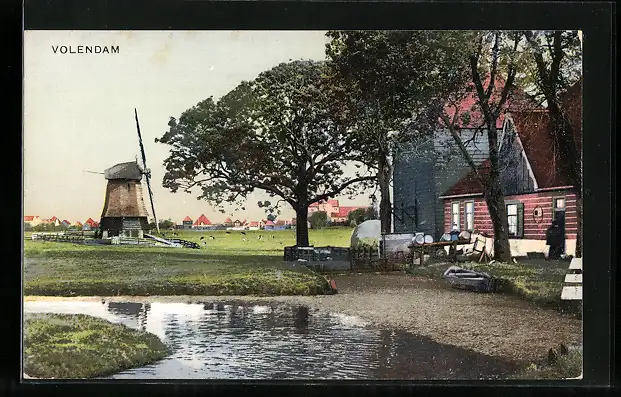 Künstler-AK Photochromie Nr. 1428: Volendam, Mühle mit Uferpartie