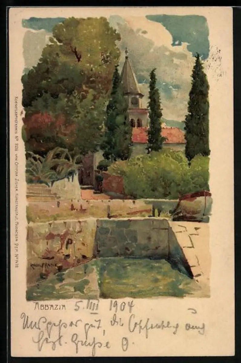 Künstler-AK Raoul Frank: Abbazia, Parkpartie mit Kirche