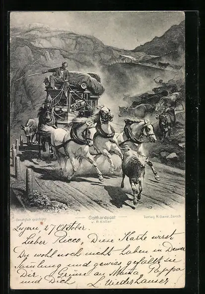 Künstler-AK Rasende Postkutsche der Gotthardpost mit Kühen