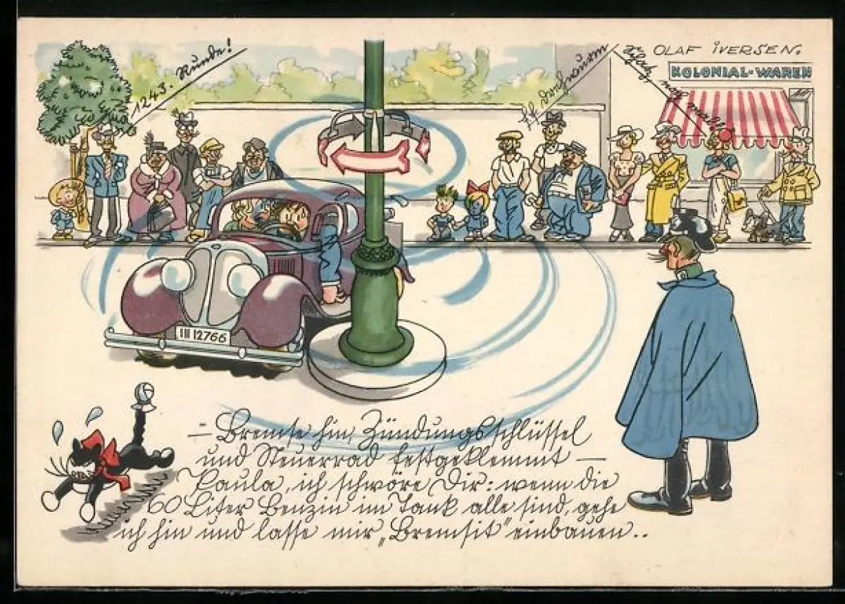 Künstler-AK Reklame für Bremsbelag Bremsit, Serie VIII Bild 1, Einem Autofahrer im Kreisel ist schwindlig