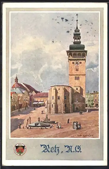 Künstler-AK Retz, Platz an der Kirche, Deutscher Schulverein