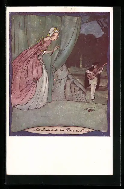 Künstler-AK Rie Cramer: La Serenade au Clair de Lune, Musiker spielt für eine Dame