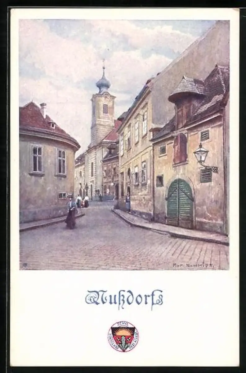 Künstler-AK Rudolf Schmidt, Deutscher Schulverein 467: Nussdorf, Blick in eine Strasse