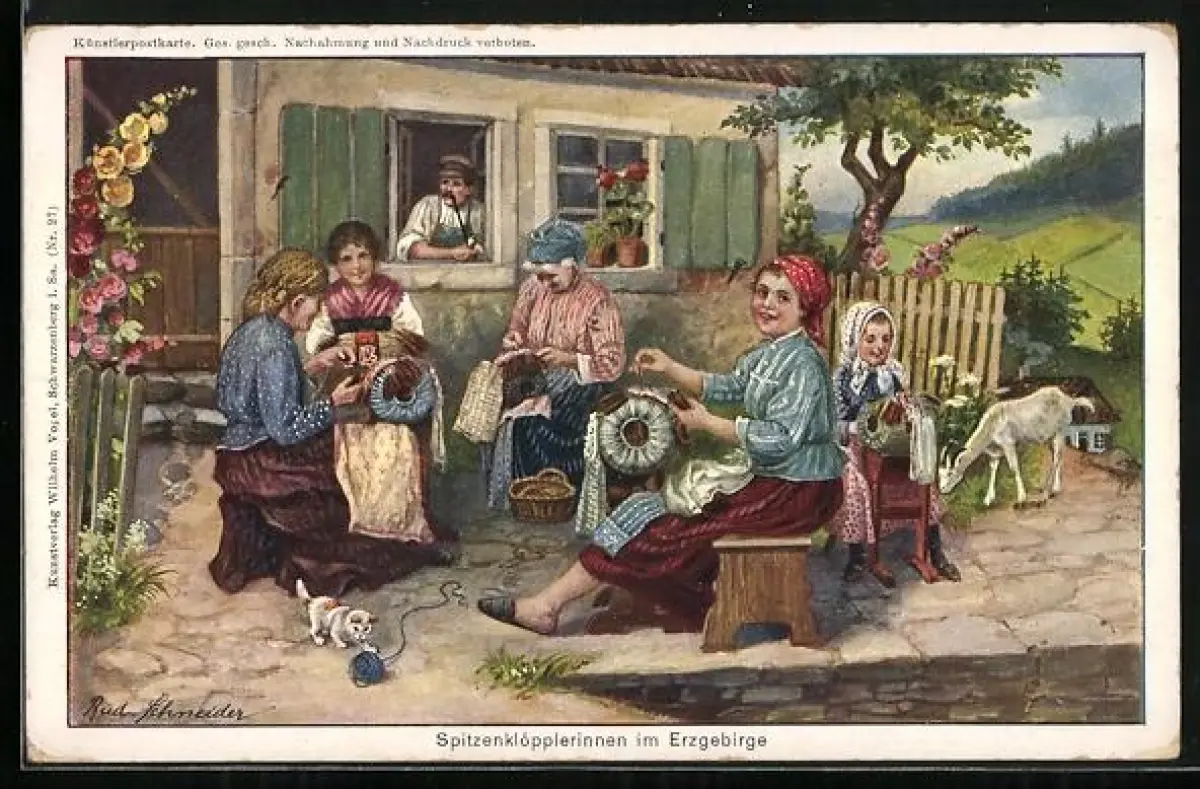 Künstler-AK Rudolf Schneider: Spitzenklöpplerinnen im Erzgebirge, Frauen in Tracht bei der Arbeit vor dem Haus