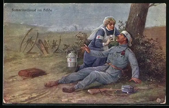 Künstler-AK Samariterdiesnt im Felde, Krankenschwester versorgt Verwundeten, Rotes Kreuz