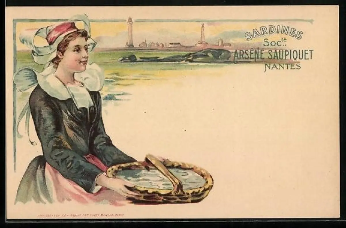 Künstler-AK Sardines Socte Arsène Saupiquet de Nantes, Dame mit Korb voller Fisch