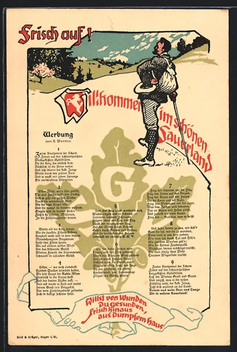 Künstler-AK Sauerland, Frisch auf!, Wanderer und sommerliche Landschaft, Tourismus