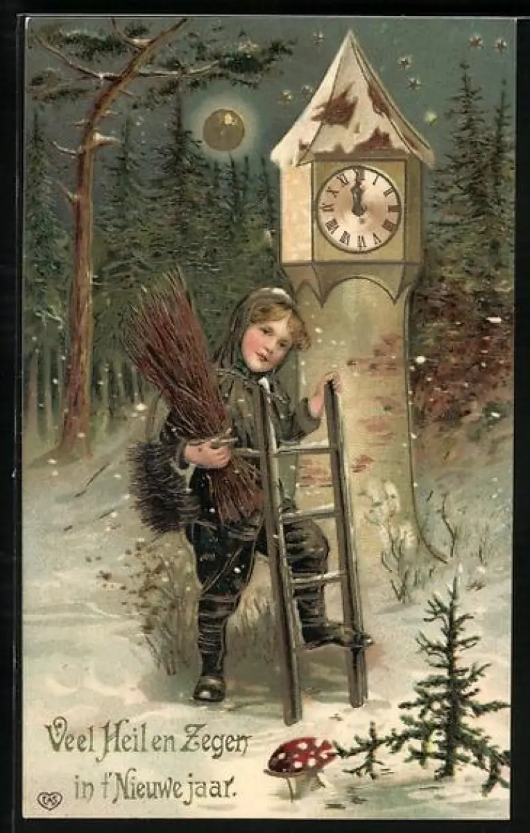 Künstler-AK Schornsteinfeger Junge schaut verträumt, Turmuhr steht auf 12