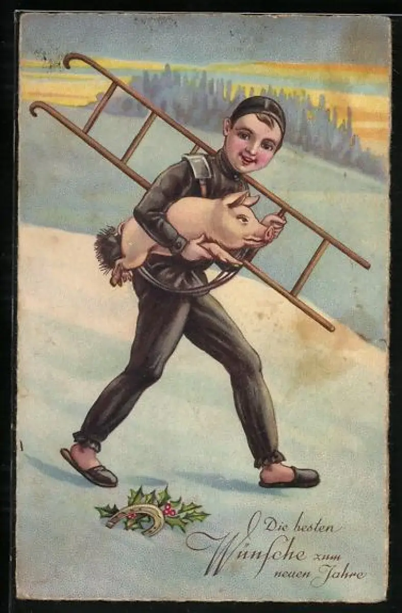 Künstler-AK Schornsteinfeger trägt ein Glücksschwein unterm Arm