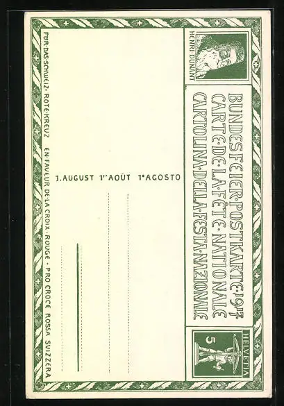 Künstler-AK Schweizer Bundesfeier 1917, Soldat und Arbeiter mit Flaggen, Ganzsache