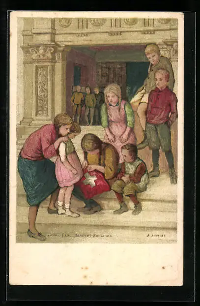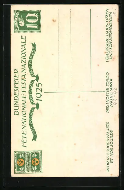 Künstler-AK Schweizer Bundesfeier 1925, Kinder nähen an einer Flagge vor einem Gebäude, Ganzsache