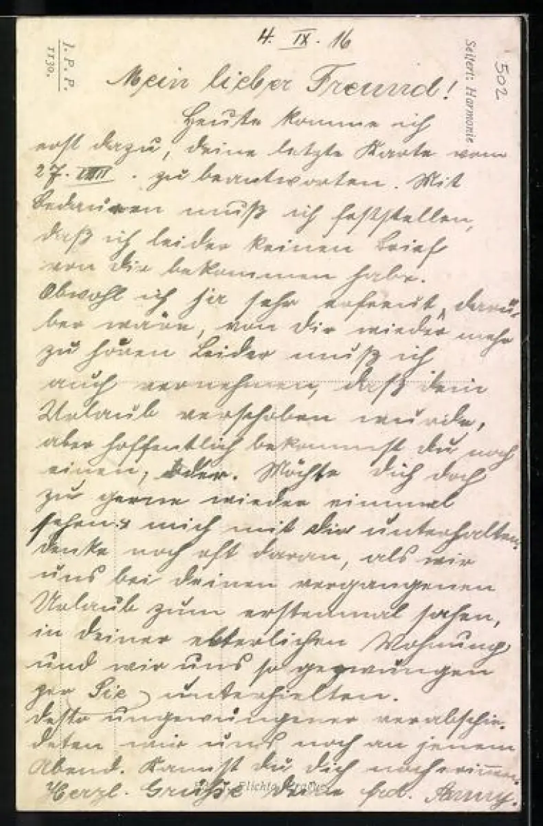 Personenbezogene Daten auf der Rückseite der Karte wurden durch blauen Textmarker unkenntlich gemacht. Die blauen Stellen sind auf die Vorderseite durchgeweicht und wirken sich negativ auf das Postkartenfoto aus