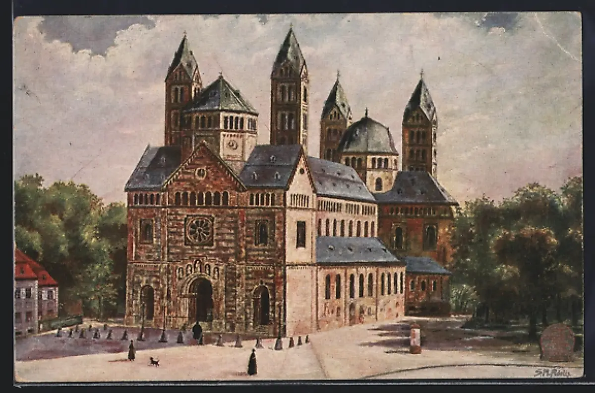 Künstler-AK Speyer, Kaiserdom, Morgenstimmung mit Passanten