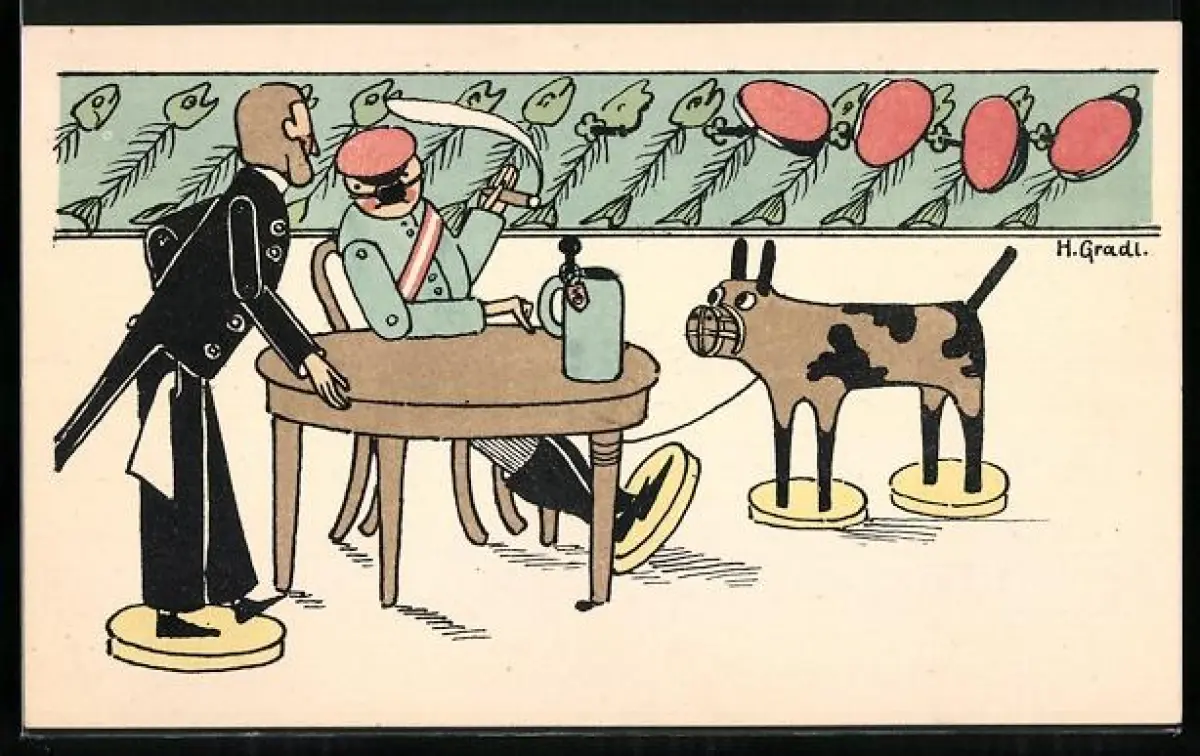 Künstler-AK Spielzeug-Student, Kellner und Hund aus Holz