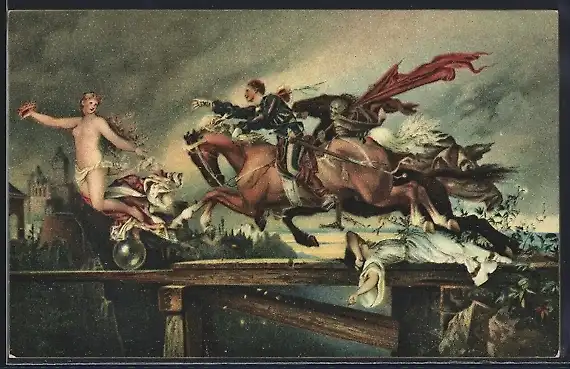 Künstler-AK Stengel & Co. Nr. 29749: Reiter und der Tod hinter nackter schwebender Frau mit Krone, Allegorie Glück