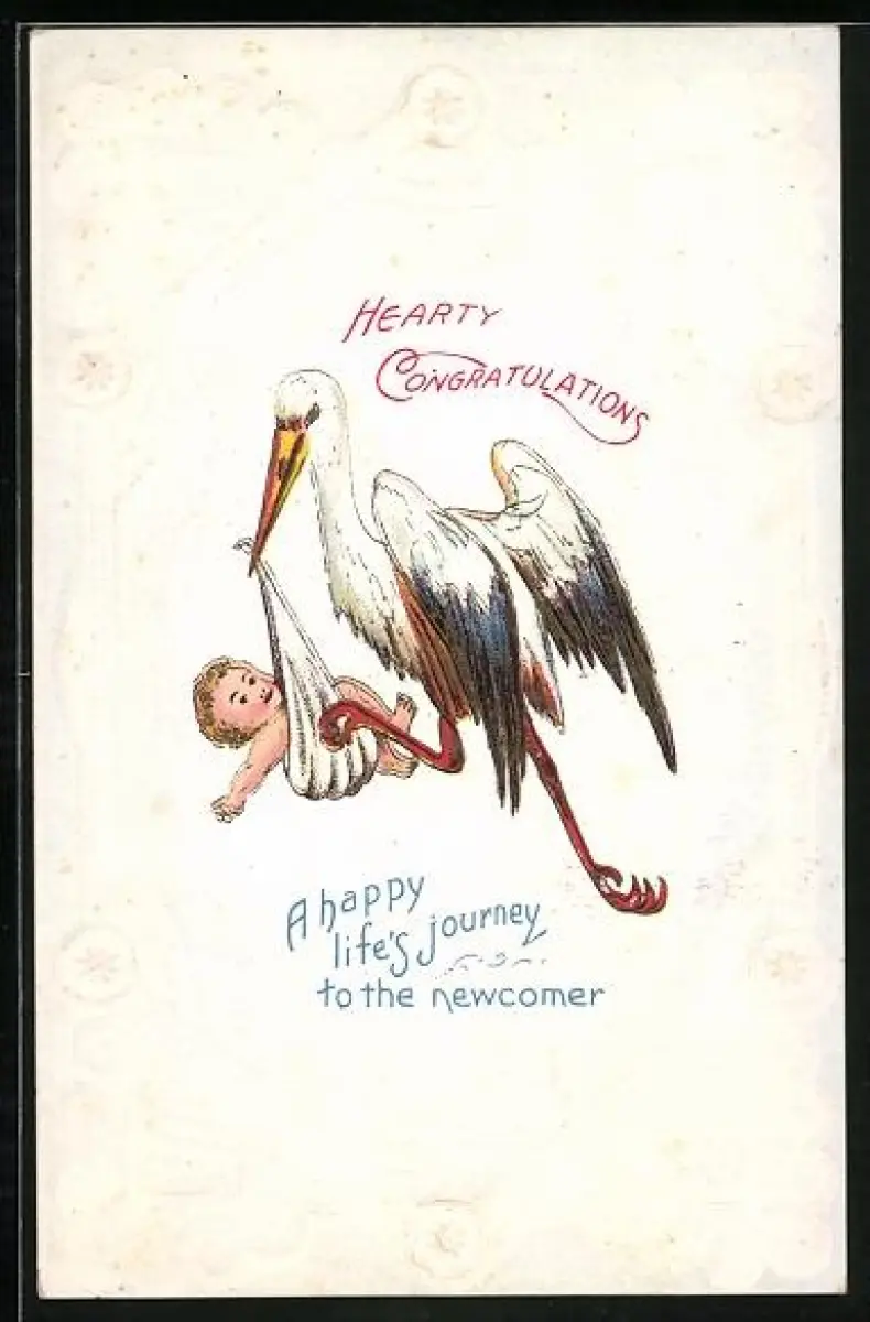 Künstler-AK Storch bringt ein Baby, Hearty Congratulations