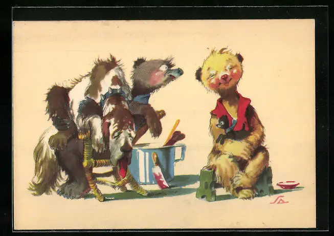 Künstler-AK Teddy genüsslich mit Hündchen im Schoss