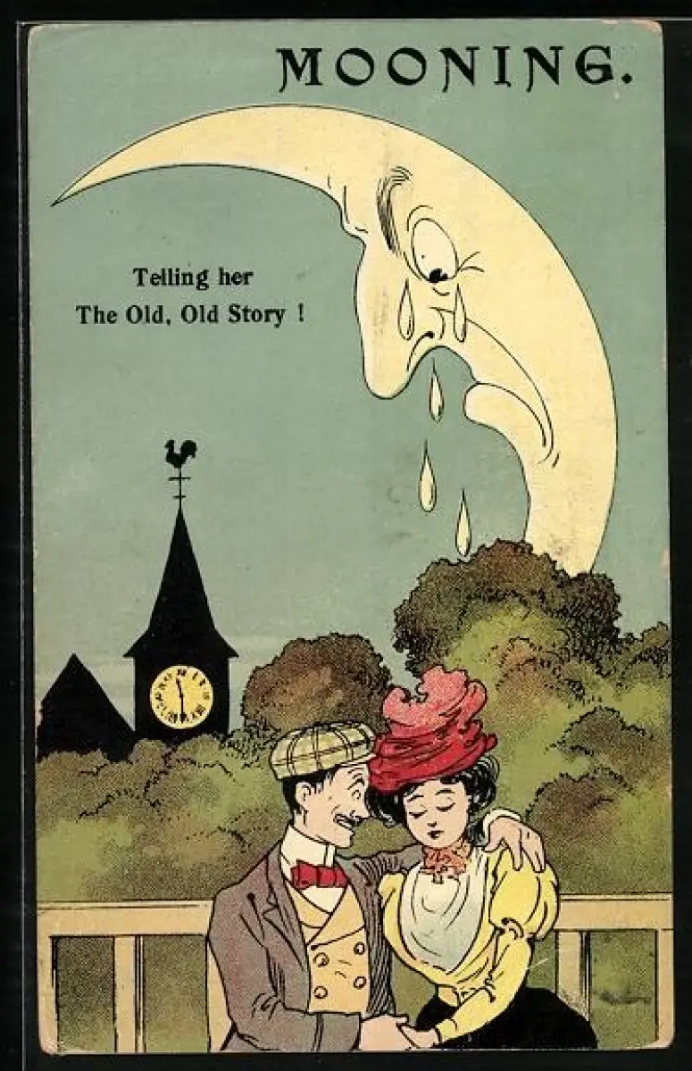 Künstler-AK Trauriger Mond beobachtet ein Paar in einem Park