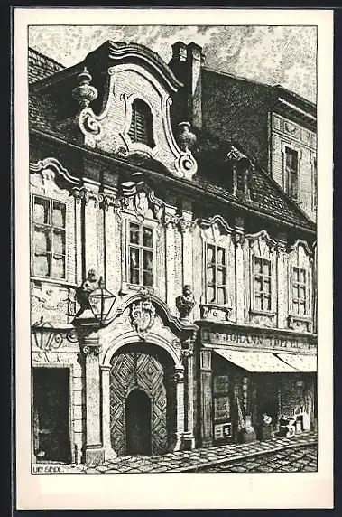 Künstler-AK Ulf Seidl: Wien, Blick auf Wohnhaus, Johann Töpfel-Geschäft