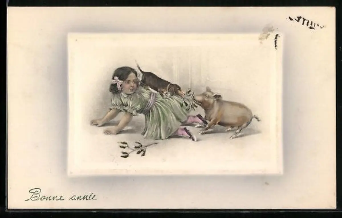 Künstler-AK V.K., Vienne Nr. 5066: Mädchen spielt mit Dackel und Schwein, Neujahrsgruss