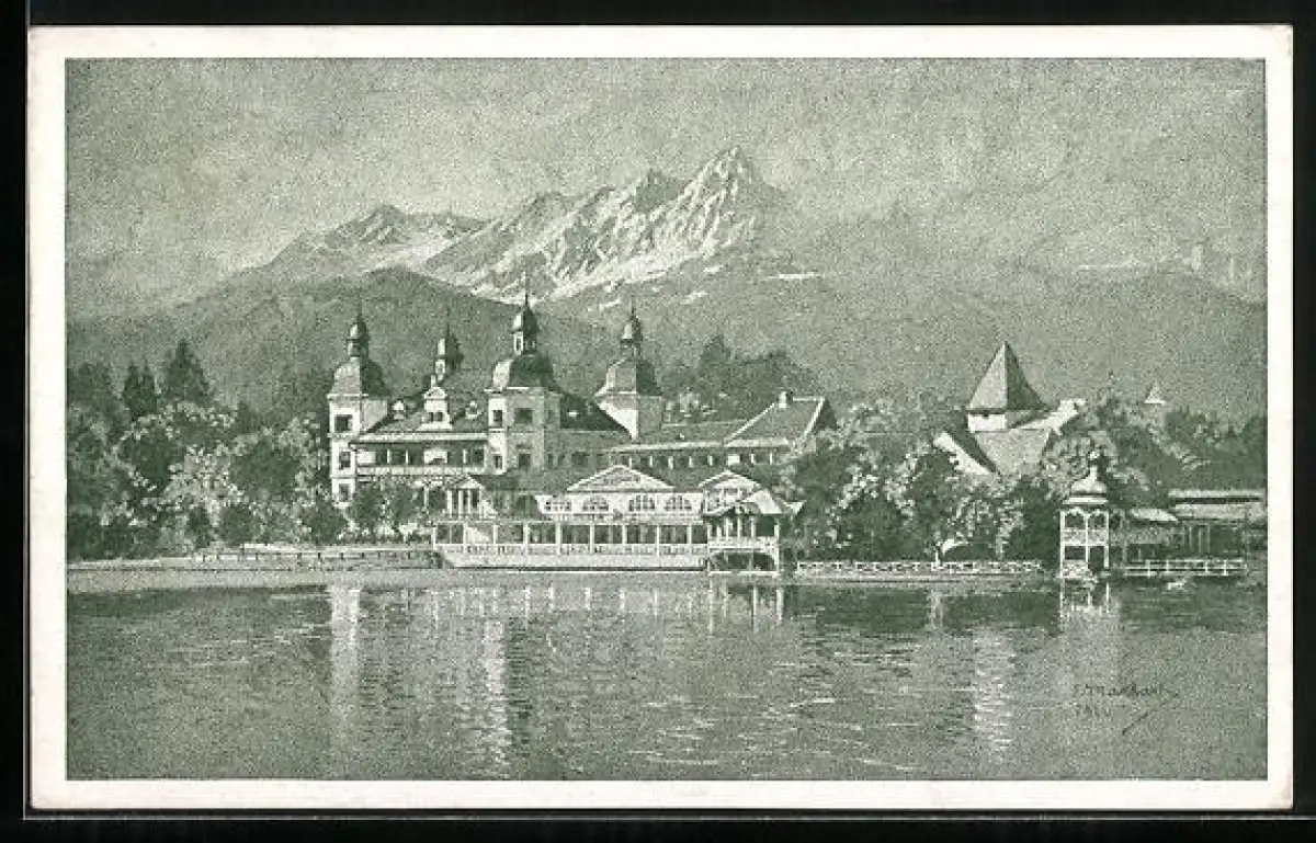 Künstler-AK Velden am Wörthersee, Blick auf den Ort vom See aus