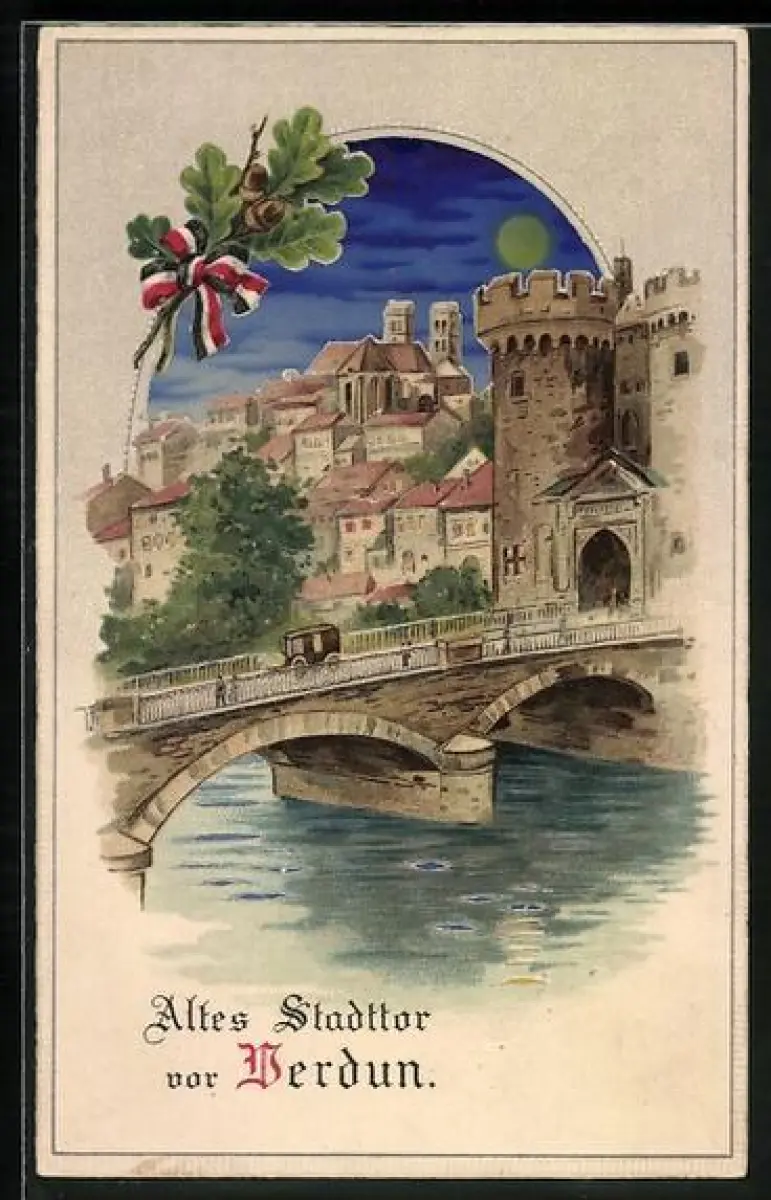 Künstler-AK Verdun, Altes Stadttor, Propaganda 1. Weltkrieg, Halt gegen das Licht