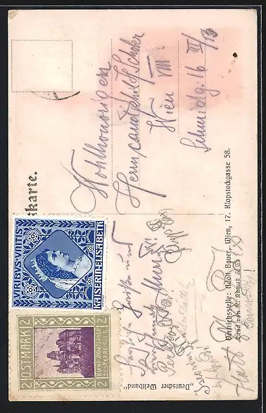 alte Ansichtskarte, gelaufen, Briefmarke entfernt, rückseitig Oberflächenschaden, guter Zustand