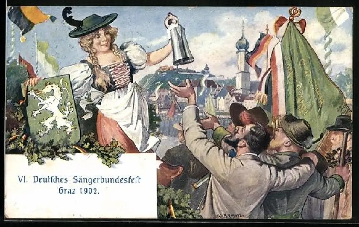Künstler-AK W. Braun: VI. Deutsches Sängerbundesfest Graz 1902, Dame in Tracht mit Bierkrug und Wappen