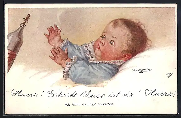 Künstler-AK Wally Fialkowska: Nahrungssorgen, Säugling mit unerreichbarer Trinkflasche