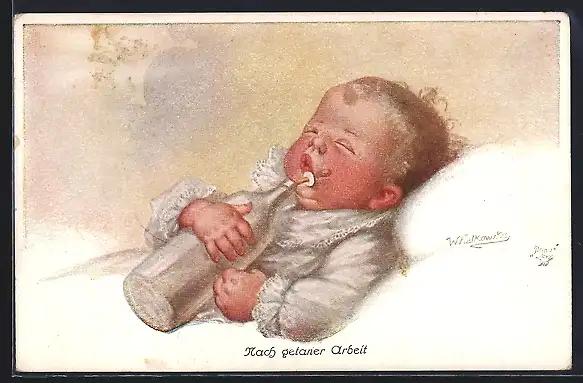 Künstler-AK Wally Fialkowska: Schlafendes Kleinkind mit Trinkflasche