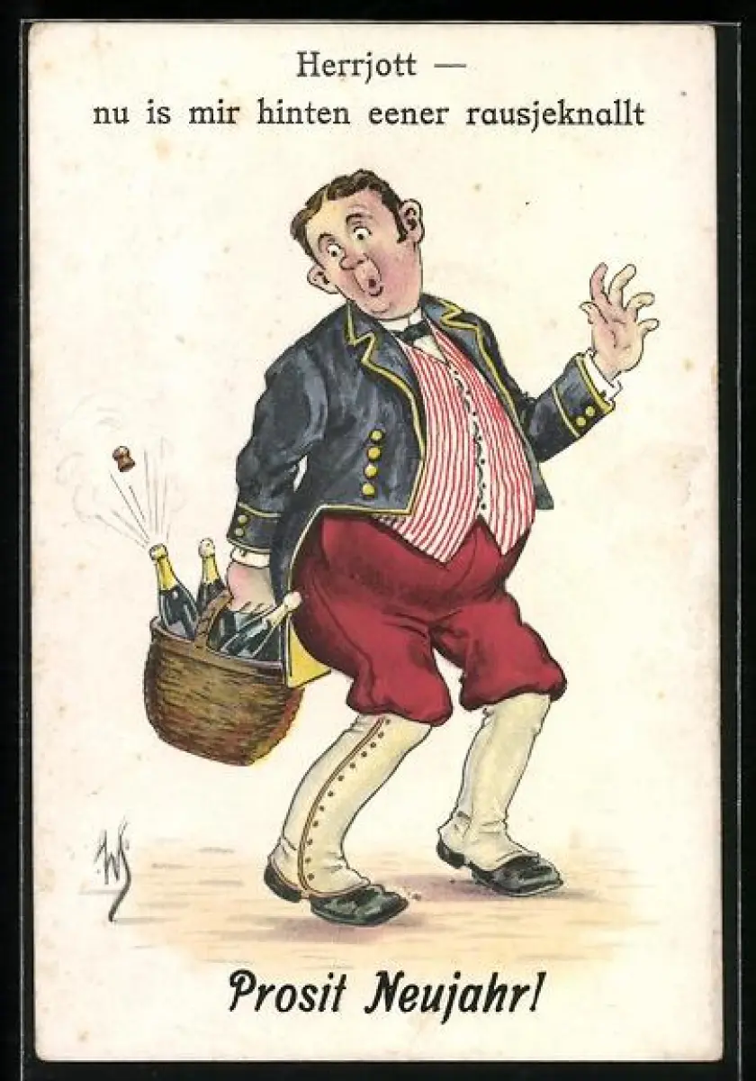 Künstler-AK Willi Scheuermann: Herrjott - nu is mir hinten eener rausjeknallt, Korken springt aus der Sektflasche