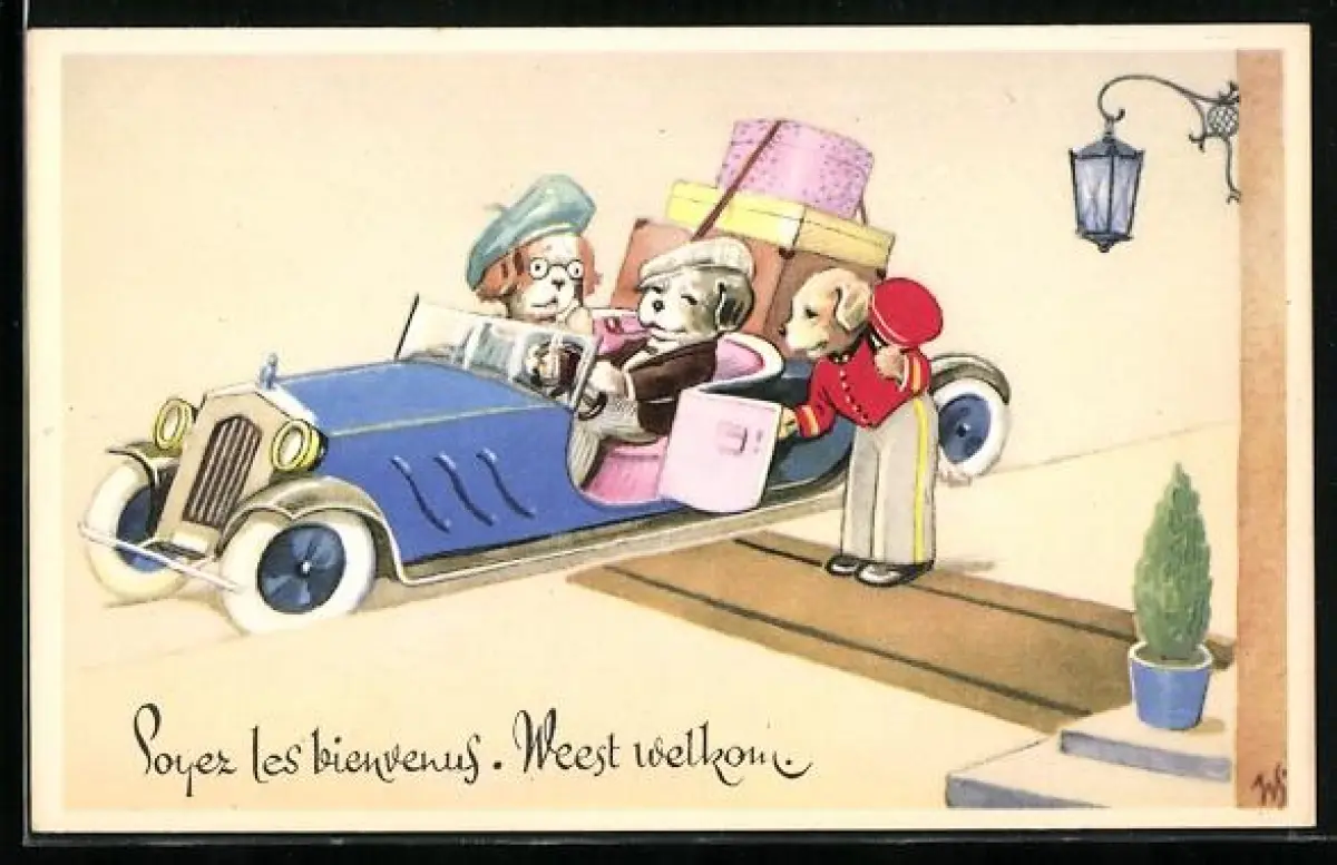 Künstler-AK Willi Scheuermann: Hunde im Auto