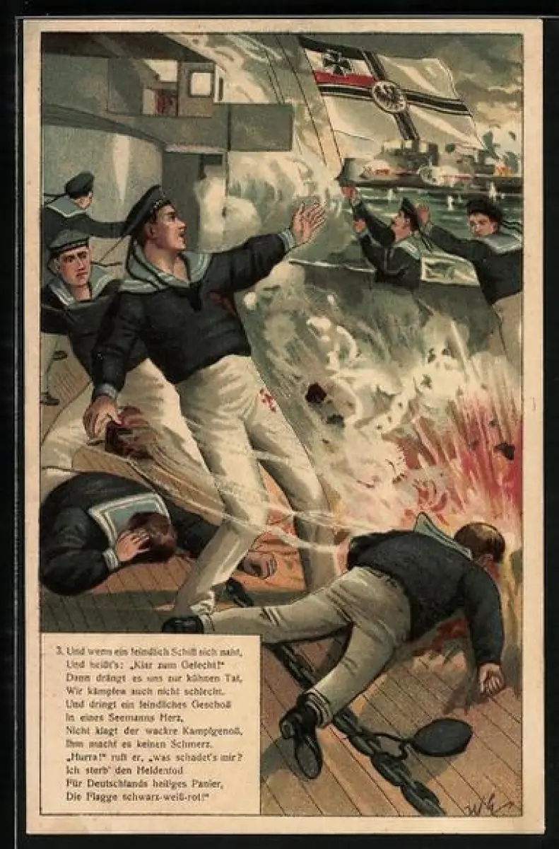 Künstler-AK Willy Stoewer: Und wenn ein feindlich Schiff sich naht..., Kriegsschiff im Gefecht