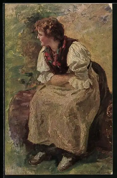 Künstler-AK Wohlgemuth & Lissner, Primus-Postkarte No.3224: Frau in Tracht sitzt auf einer Bank