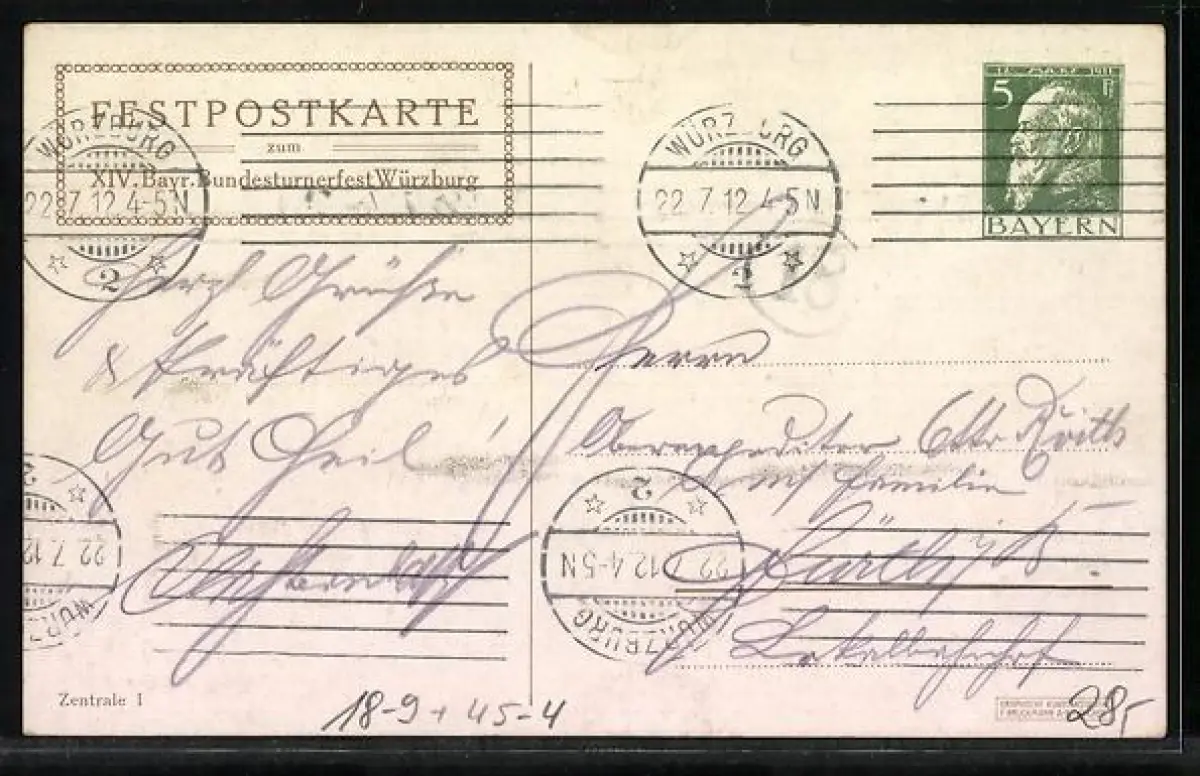 Künstler-AK Würzburg, XIV. Bayr. Turnfest 1912, Festzug, Ganzsache Bayern