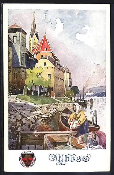 Künstler-AK Ybbs, Partie mit Waschfrau, Deutscher Schulverein