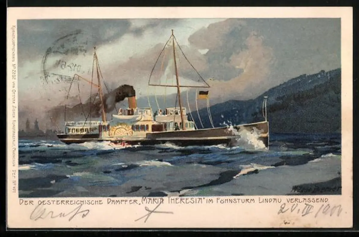 Künstler-AK Zeno Diemer: Der österreichische Dampfer Maria Theresia im Föhnsturm Lindau verlassend
