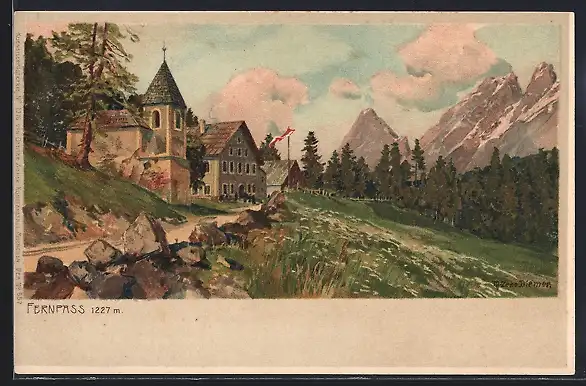 Künstler-AK Zeno Diemer: Nassereith /Tirol, Fernpass, Wirtschaft auf dem Fernpass