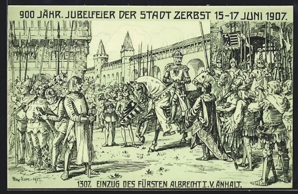 Künstler-AK Zerbst, Festpostkarte 900 jähriges Jubiläum 1907, Einzug des Fürsten Albrecht I. von Anhalt
